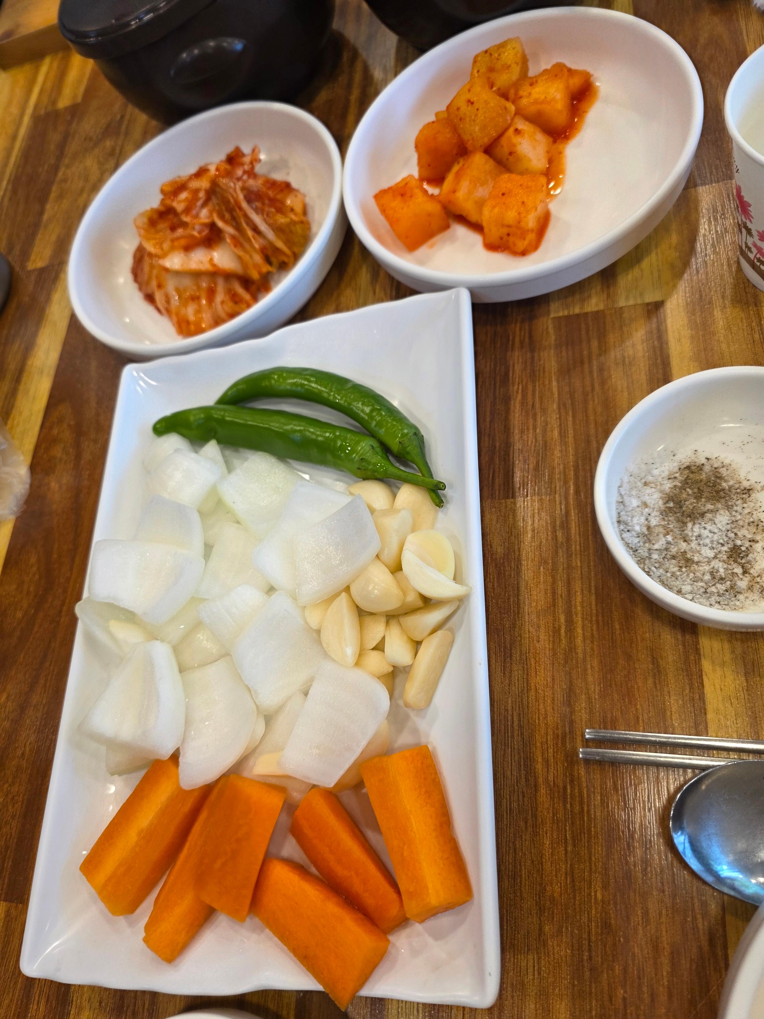 기본반찬으로 배추김치, 깍두기, 당근, 양파, 마늘, 청양고추가 나옵니다.